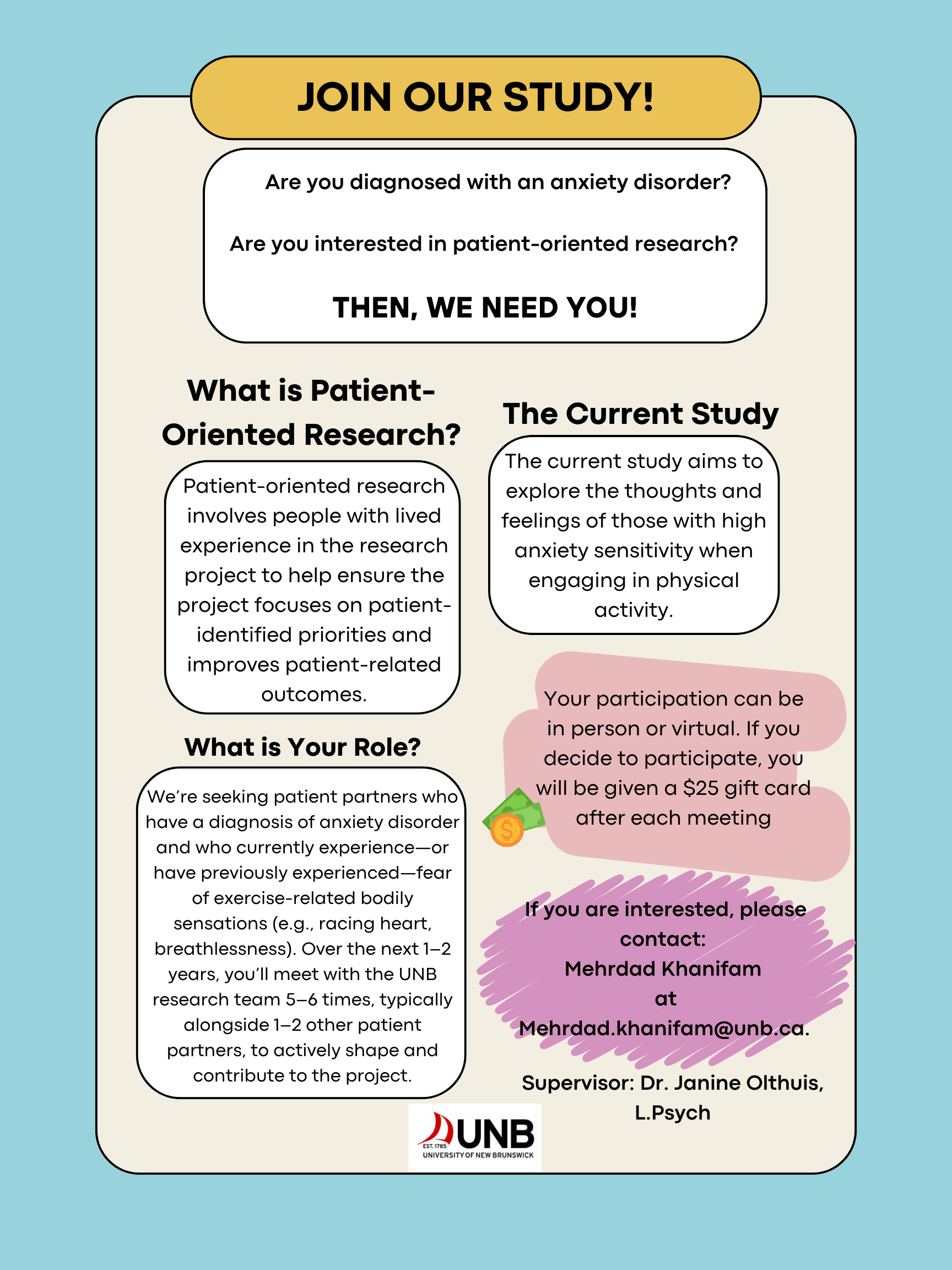 Eligible people with lived or living experience should live in New Brunswick and have a diagnosis of an anxiety disorder and endorse anxiety sensitivity symptoms. Interested individuals will complete a brief (~5-minute) online screening survey to confirm fit before joining the committee.